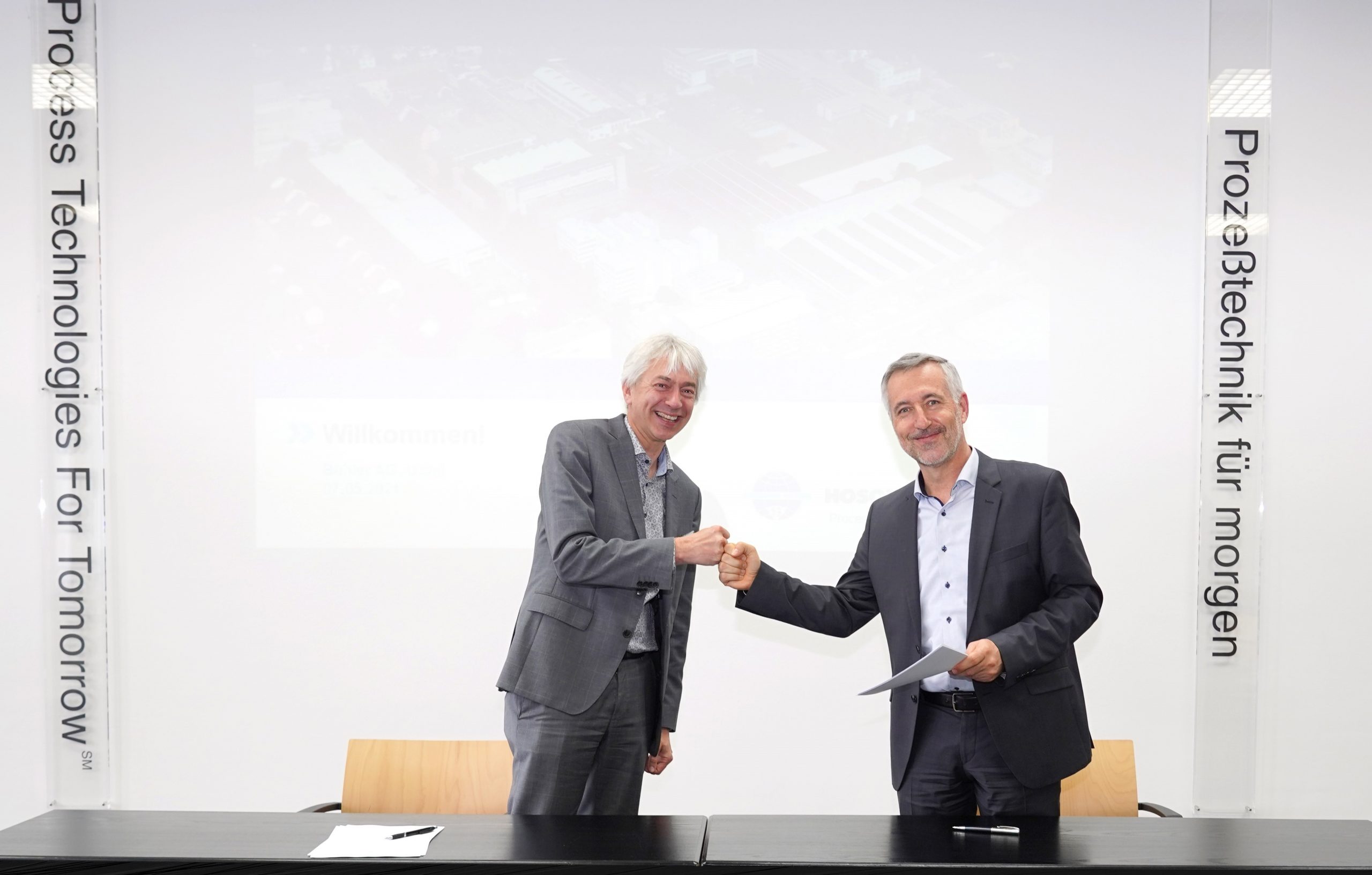 Johannes Wick, CEO Grains & Food at Bühler, and Dr. Antonio Fernández, chairman of the executive board at Hosokawa Alpine, at the signing of the collaboration agreement.