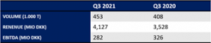 The EBITDA for the quarter fell from DKK 326 million (USD in Q3 2020 to DKK 282 million (USD in Q3 2021 for the consolidated companies, while the non-consolidated joint ventures and associates are recognised in the Q3 2021 consolidated financial statements at a DKK 36 million (USD share of profit after tax, compared with a DKK 44 million (USD share of loss in the Q3 2020 period. The significant improvement was generally attributable to Salmones Austral in Chile, as settlement prices on farmed salmon are now improving strongly in that market from a low point caused by the coronavirus pandemic.