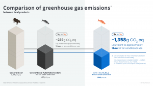 The 20% reduction roughly translates to about 1 hour of home air conditioner use. When compared against the carbon footprint for beef produced in Japan, Umi to Sachi’s product had a difference of 1,360g CO2 eq per 100g of product (approximately 5.7 hours of home air conditioner use). In the future, Umitron is planning to add more data on GHG reductions for products farmed using Umitron Cell.