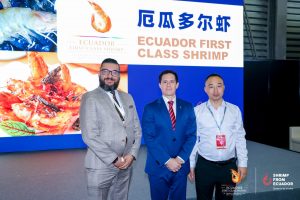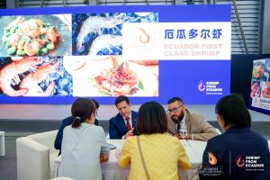 This initiative is a part of the ongoing World Seafood Shanghai International Fair, which extends on August 25. Within this gathering, 16 Ecuadorian companies dedicated to shrimp production and/or export are steadfastly showcasing their offerings under the banner of “FIRST CLASS SHRIMP” at the Shanghai New International Expo Center.