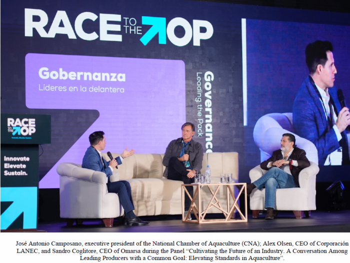 AquaExpo Guayaquil, the Sustainable Shrimp Partnership (SSP) and the National Chamber of Aquaculture (CNA) hosted the first edition of the new sustainability forum, Race to the Top. With over 300 participants, the event, held at the Guayaquil Convention Center, brought together global leaders and key executives from Ecuador to discuss how the country’s shrimp industry has become a global benchmark for sustainability.