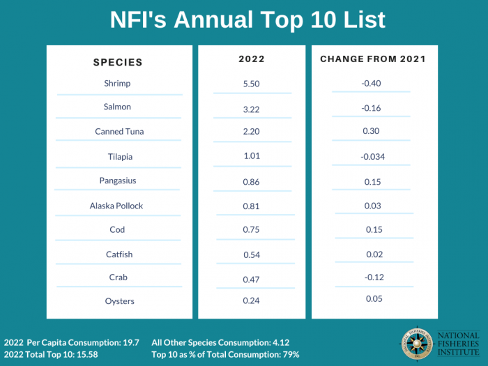 “The 2022 Top 10 List reflects the correction that took place following the 2021 supply surge which saw a 9% increase in available seafood,†NFI Programs Director, Richard Barry, said.