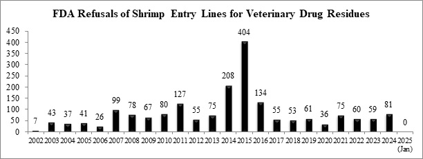 This is the second consecutive month in which the FDA has reported no entry line refusals of shrimp for the presence of veterinary drug residues, despite reporting 81 such refusals over the first eleven months of 2024.