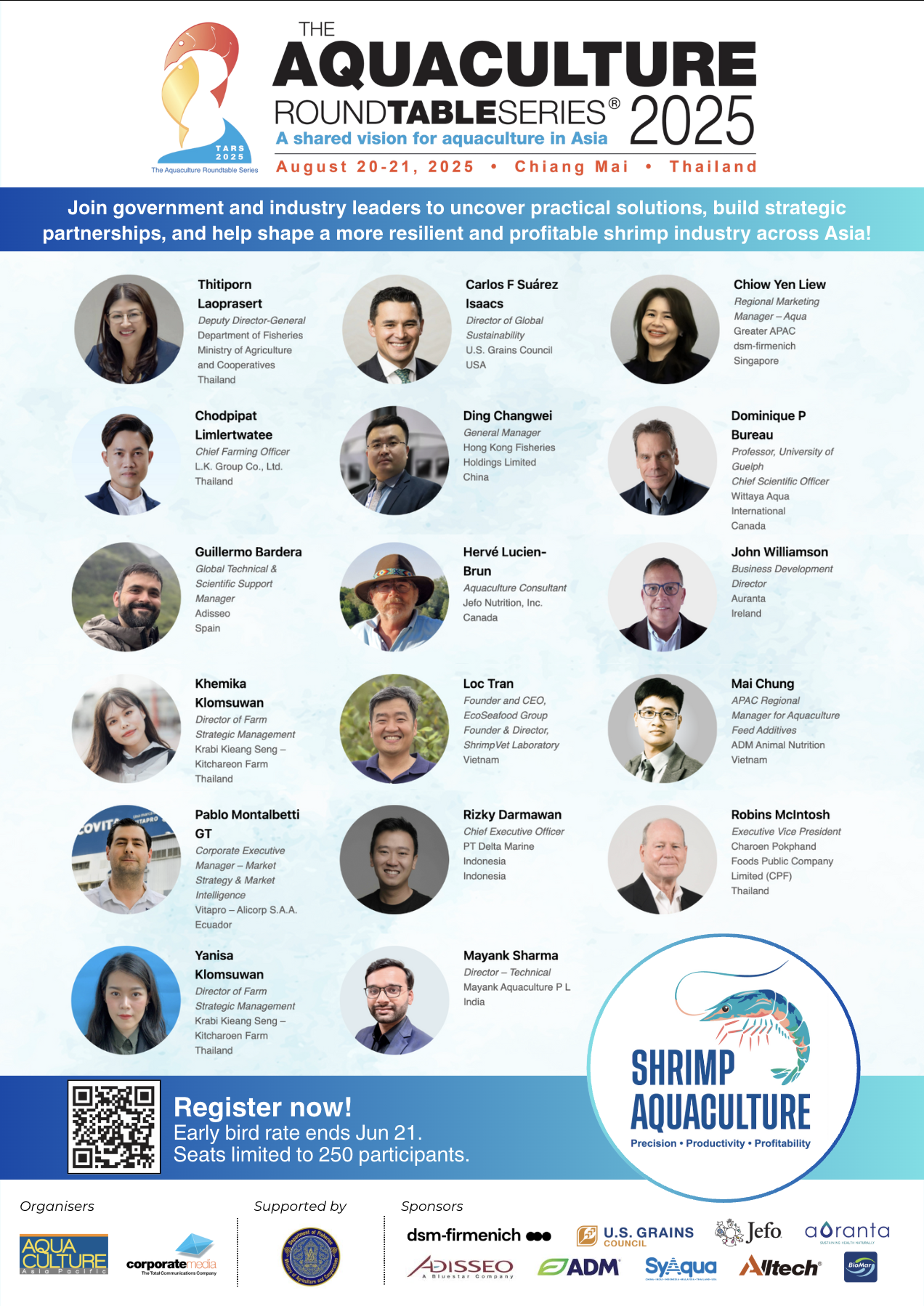 The Aquaculture Roundtable Series® (TARS) 2025 on Shrimp Aquaculture will focus on precision farming, productivity, and profitability. The organizers have announced the preliminary program along with the list of speakers and panellists. The conference is scheduled for August 20-21, 2025, in Chiang Mai, Thailand.