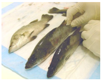 Scale drop disease (SDD) in Asian seabass Lates calcarifer is characterised by skin and scale loss, multifocal tissue deaths, and splenic infarcts. The disease spreads in the population, with clinical disease seen in older fish (>200-300g, Figure 1). “The loss of extensive areas of skin results in fish dying from dehydration in seawater. Bringing fish species tolerant to lower salinity to freshwater or lowering salinity to 15‰ to control the dehydration reduces mortality rate. But this is not easy as some farms do not have access to large volumes of freshwater.” She added that any pathogens that damage skin will cause dehydration in fish in seawater. SDD also causes severe inflammation and blockage of blood supply. “The spleen is an important immune organ in fighting diseases. Loss of the spleen means that fish becomes more susceptible to infection by bacteria commonly present in the water. Fish with SDD may die from dehydration or secondary bacterial infection. Vaccination can prevent fish from succumbing to bacterial infections.” Gibson-Kueh’s message was, “To know not only the pathogens but also understand how they affect and why they kill the fish.”
