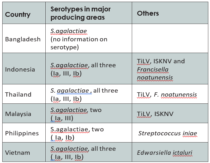 “In Thailand, there is the prevalence of specific serotypes of S. agalactiae with tilapia lake virus (TILV) in various districts in Khon Kean, Nong Kai, Petchaburi, Samut Prakan, and with Francisella noatunensis in Uttaradit. In Malaysia, S. agalactiae (Ia, III) are found together with TILV and spleen and kidney necrosis virus (ISKNV).”