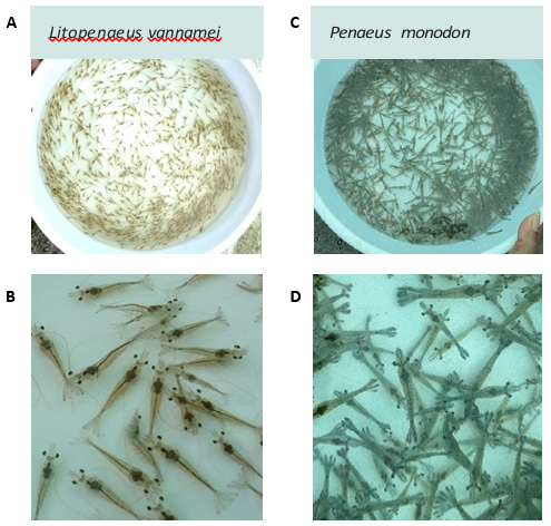 • Reduction in days of culture helps the shrimp to reach marketable size before white spot syndrome virus (WSSV) outbreak (10 to 12g for vannamei, 33 to 40g for black tiger). Figure 3 shows the post larvae rearing for both species.