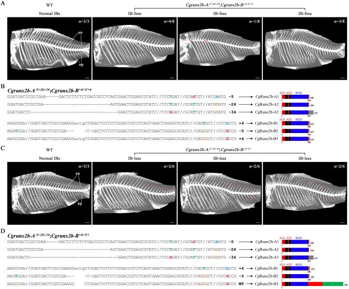 Intermuscular bones phenotypes and mutated genotypes in Cgrunx2b-A and Cgrunx2b-B mutant of gibel carp. /Institute of Hydrobiology (IHB) of CAS