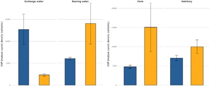 In Thailand, aggregated data indicated considerably higher EHP levels in exchange water than in rearing water, suggesting that incoming water may serve as an important contamination source. In contrast, Vietnamese farms exhibited much lower EHP densities in exchange water, likely reflecting the widespread application of stronger disinfection and water-treatment protocols. Nevertheless, EHP concentrations increased sharply in rearing water, pointing to internal amplification during culture despite clean water inputs.