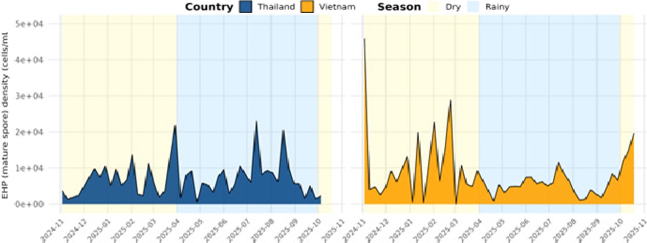 Seasonal patterns in EHP spore densities revealed clear geographical differences between Thailand and Vietnam (Figure 4). In both countries, EHP levels fluctuated across dry and rainy seasons, reflecting the influence of environmental conditions and management practices on microbial risks in shrimp ponds. Thailand displayed more stable yet persistent EHP signals throughout the year, whereas Vietnam showed greater volatility during the dry season. These trends highlight the interaction between seasonality and water management in shaping pathogen pressure.