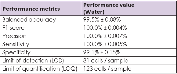 Proprietary machine-learning workflows are then used to fine-tune models capable of detecting these mature EHP spores in the presence of naturally occurring microbiota from shrimp ponds and hatcheries. In our case, this training data comprised more than 600 million single-cell data points from shrimp ponds (water, gut and hepatopancreas) and yielded highly robust model accuracy (99.5 %) and overall performance (Table 1).