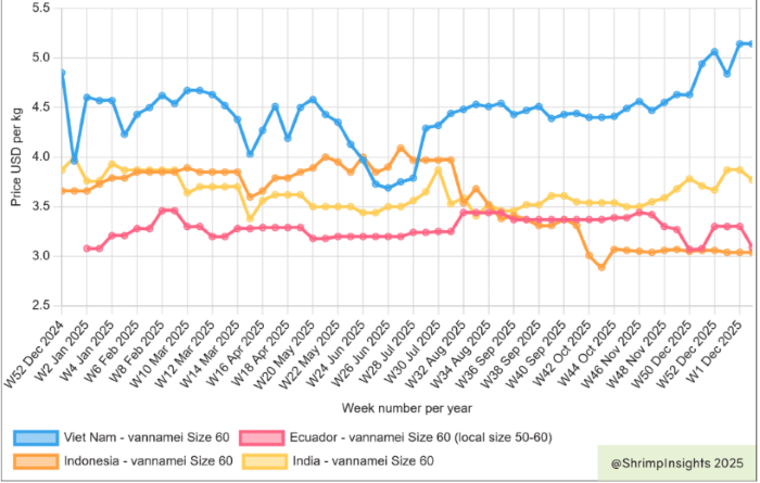 Figure 1. Vannamei shrimp farmgate prices in 2025 for Vietnam, Indonesia, India and Ecuador for size 60/kg. Source Farm Gate Price portal, Shrimp insight (2025)