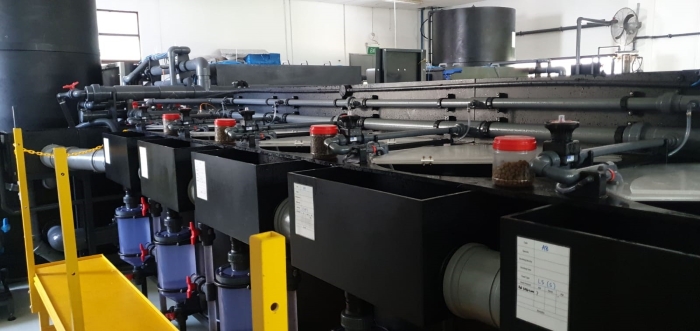 The R&D facility has state-of-the-art systems for controlled trials, digestibility studies, and performance validation under rigorous monitoring. Above, view of tanks in the aquaculture research and development (“R&D”) facility in 2019. See AAP article on New R&D centre in Singapore.